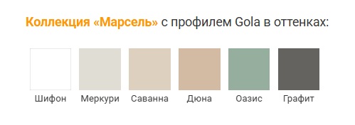 Для комплектования профилем Gola предусмотрены 8 оттенков коллекции Марсель: Шифон, Меркури, Саванна, Дюна, Оазис, Графит.