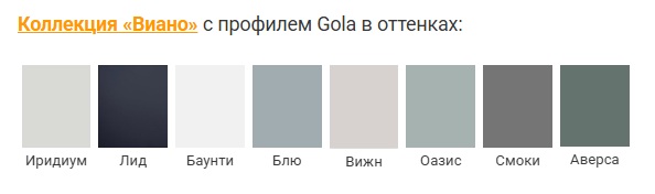 Для комплектования профилем Gola предусмотрены 4 оттенка коллекции Виано: Баунти, Вижн, Иридиум и Смоки (из общей палитры коллекции из 8 оттенков).