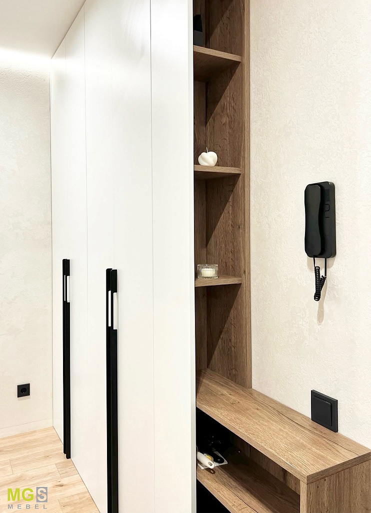 Комбинация чистых, светлых оттенков и натуральной текстуры дерева создает универсальный дизайн, который идеально впишется как в скандинавский стиль, так и в современный минимализм. Светлые фасады визуально расширяют пространство и добавляют света, а древесные вставки — теплоты и природного очарования.